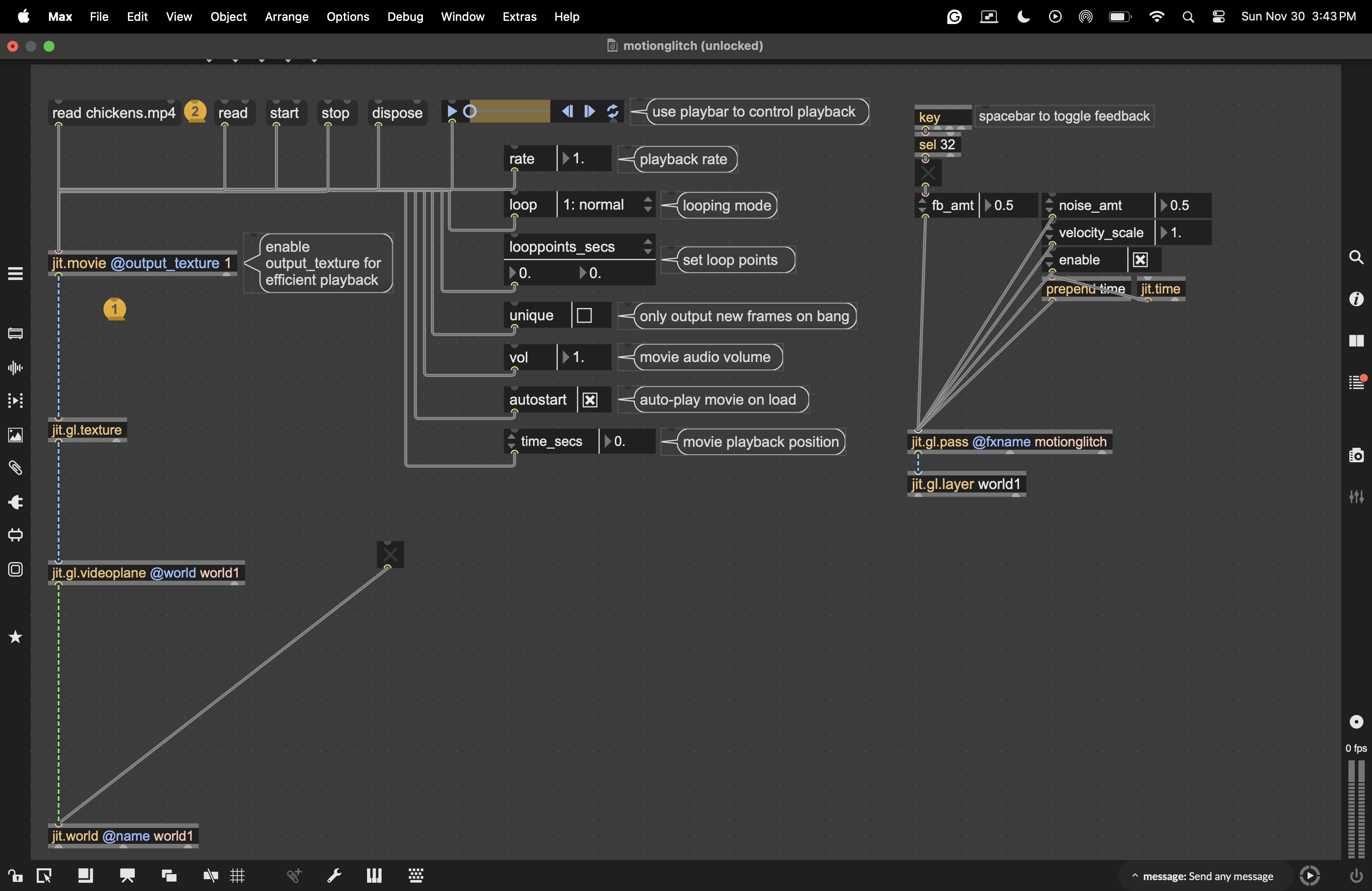 I'm just wondering how to use jit.gl.pass @fxname motionglitch with video. Like how do I get as dramatic as an effect as one gets with 3D objects? Maybe instead of chickens I need something with more dramatic cuts from one scene to the next? Whenever I bump up the feedback past 0.9 I get some really weird and wonderful colors, but the image just freezes.