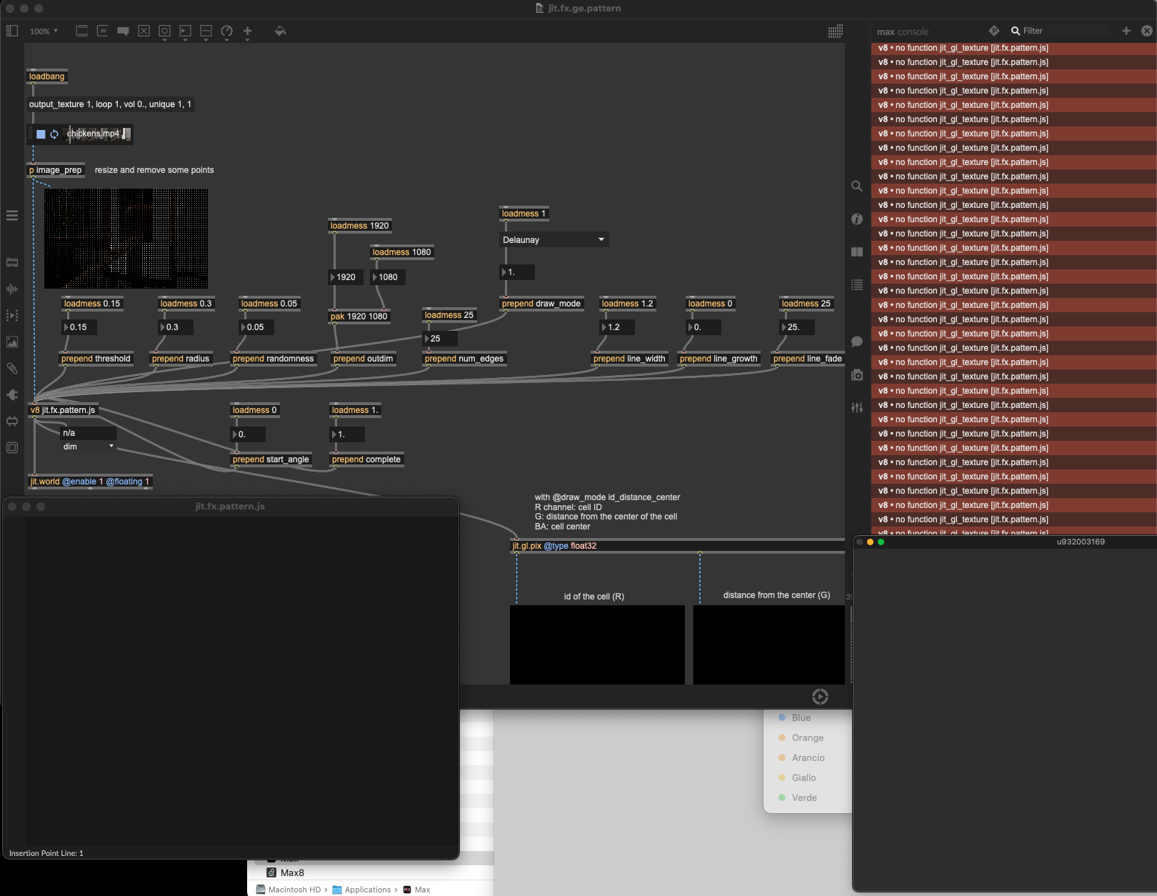 Haha I see, probably a leftover from an early version of the helper patch... You can replace [v8 jit.fx.pattern.js] by [jit.fx.ge.pattern] and it seems to work as intended. Or just open the [jit.fx.ge.pattern] help patch and you get a very similar (and working) patch.