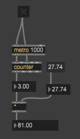 3) I have the [counter] output feed into a flonum [number] set to 2 decimal places.