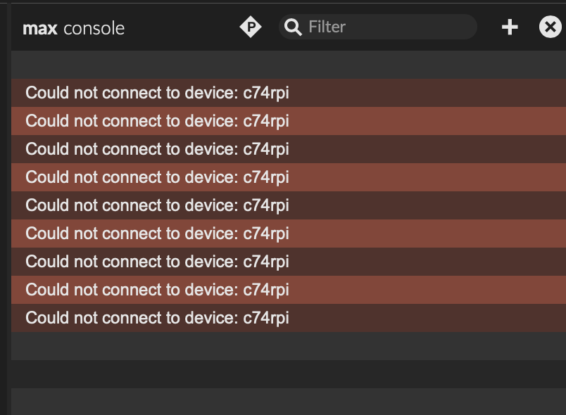 The connection to Max still fails, though, sadly. But, I can at least see feedback. Namely: now Max is showing an error in the console that reads "Could not connect to device: c74pi," continuously. I didn't have this error message before, so the good news is that it recognizes and attempts the connection.