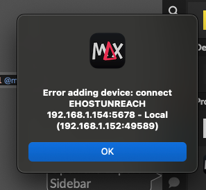 In the max export window, no success with the manual add "+". So far, I've added the hostname "c74pi," the IP that I use to access the web panel. Even with trying to format it with the port name. So I've tried manually adding "c74rpi:3000" as well as "192.168.1.154:3000." All of them seemingly have no effect. Just an empty panel with connection "failed" and the continual error message in the max console. It appears that when I have one or more of those entered in it struggles to find which one to address. So my process each time is to delete everything I manually added other than the one I want to attempt to connect to.