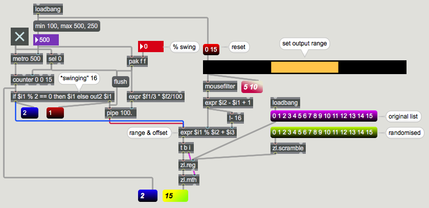 Firstly to clarify @source audio, by random I am referring to the random counter object in the patch, which is simply randomizing what steps are fetched from the multislider. But nevermind that because the swing pattern also becomes irregular on any of the counter patterns other than "up"
