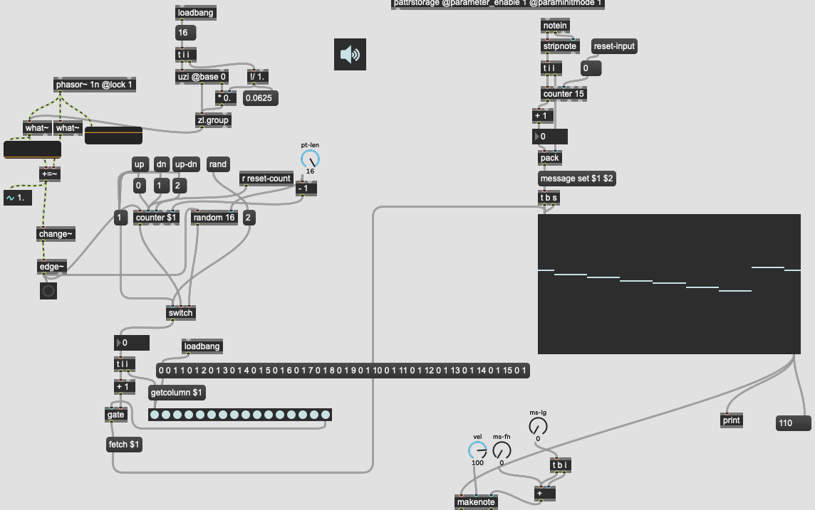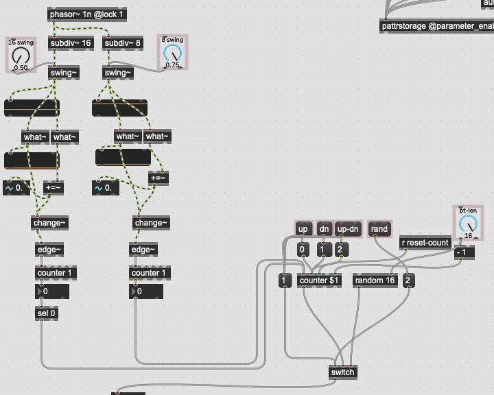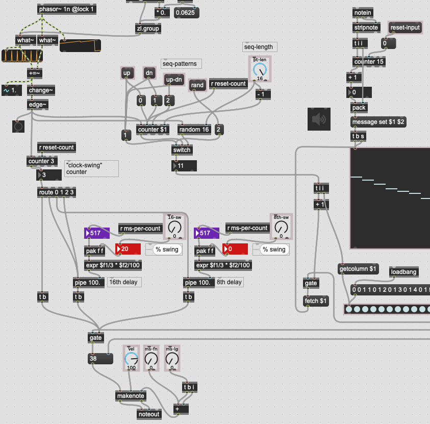 Thanks - following some of the advice here I got a working version of the sequencer. However I'm running into some trouble trying to implement swing. The first image is the working version without swing. The second is my (possibly terrible) attempt at creating parameters for 8th and 16th note swing control. The issue I'm having is that the 2 step counters for each stream of triggers (8ths, 16ths) don't seem to be consistently lining up as they should. I tried sending a reset to the phasor when starting the sequencer (transport), but that didn't seem to work either. Possibly related - sometimes the swing of the 8th notes seems to work "backwards" (i.e. it moves the second of each pair of 8th notes earlier in time rather than later).