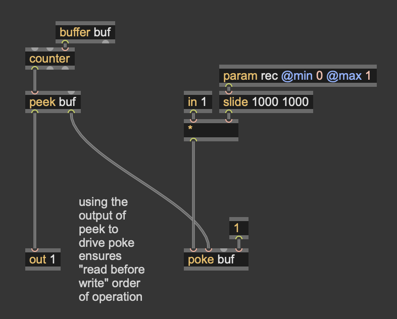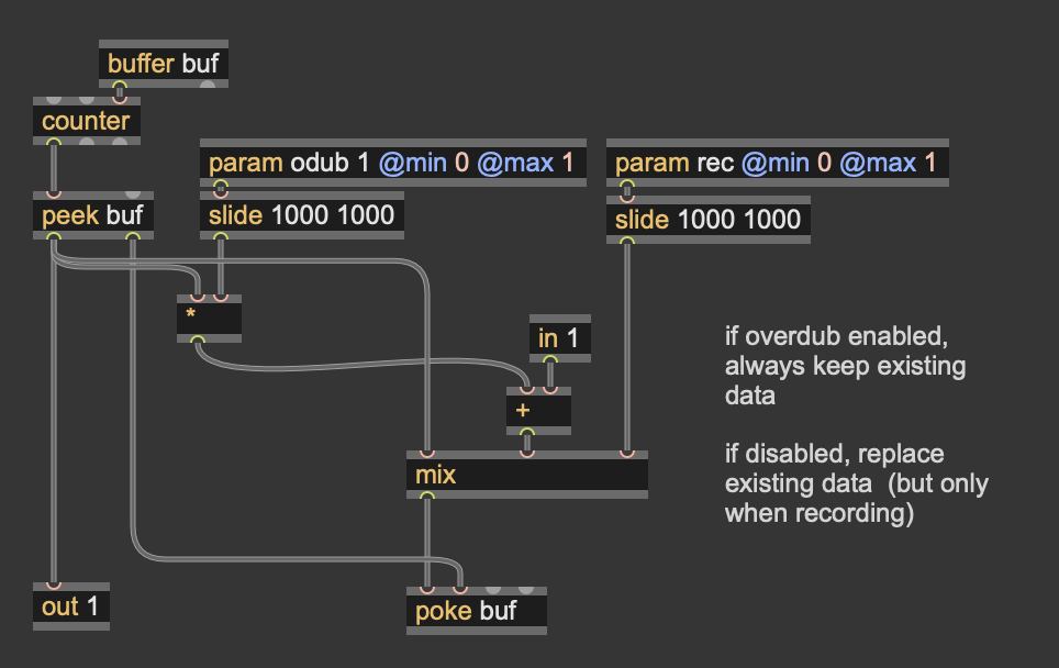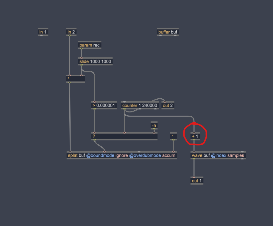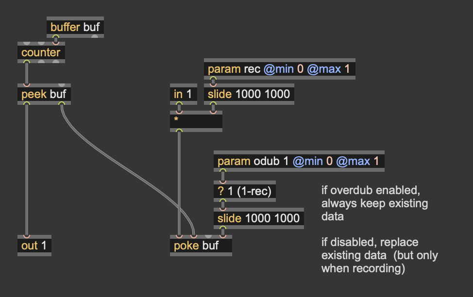 A counter continuously runs, feeding the sample index of both the splat (writing, when rec>0) and wave (reading, always). When rec=1 it fades in the audio input (in2) to the input of splat.