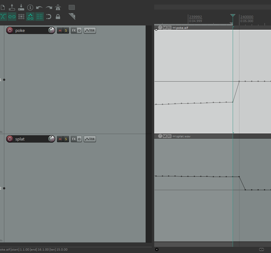 When I use splat there is a click at the loop point after I record in audio that crosses said point. When I put poke in its place, there is no click. It seems unrelated to overdub modes, all of which I tried. Same behavior: splat clicks on the loop point, poke doesn't.