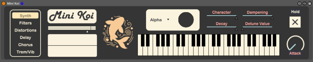 The Mini Koi is a powerful and expressive Max for Live instrument built around the Karplus–Strong algorithm, designed to generate organic, evolving and physically inspired sounds. Drawing from physical modeling synthesis, Mini Koi excels at creating everything from realistic plucked tones to experimental textures and hybrid electronic timbres.