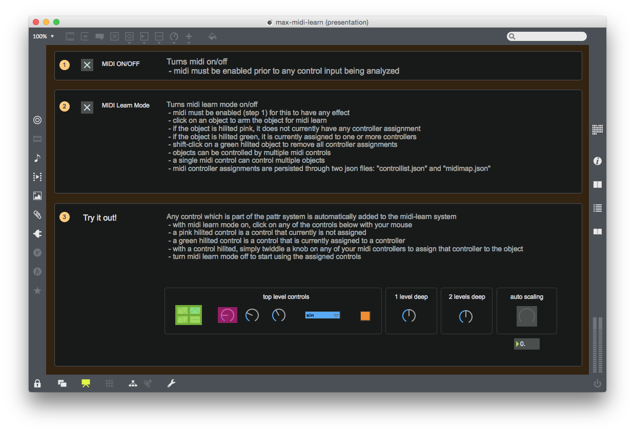 The MIDI learn system is encapsulated into a single Max patcher which uses a js object (and a javascript file). The included project shows an example of how this patcher can be used.